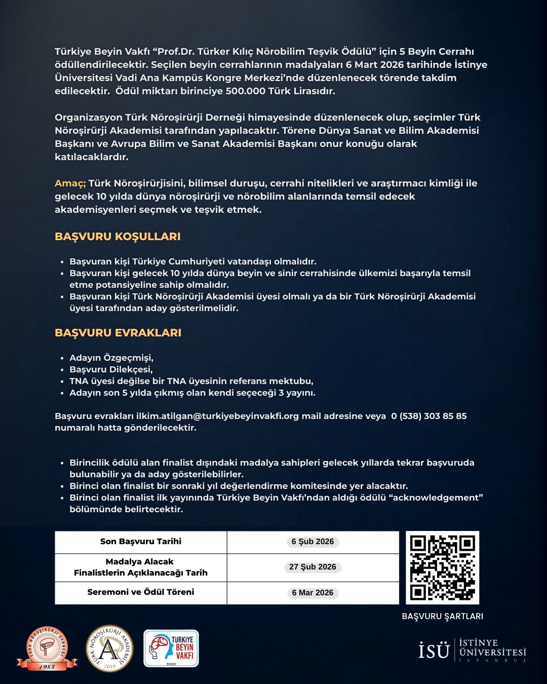 Türkiye Beyin Vakfı Prof. Dr. Türker Kılıç Nörobilim Teşvik Ödülü 2026